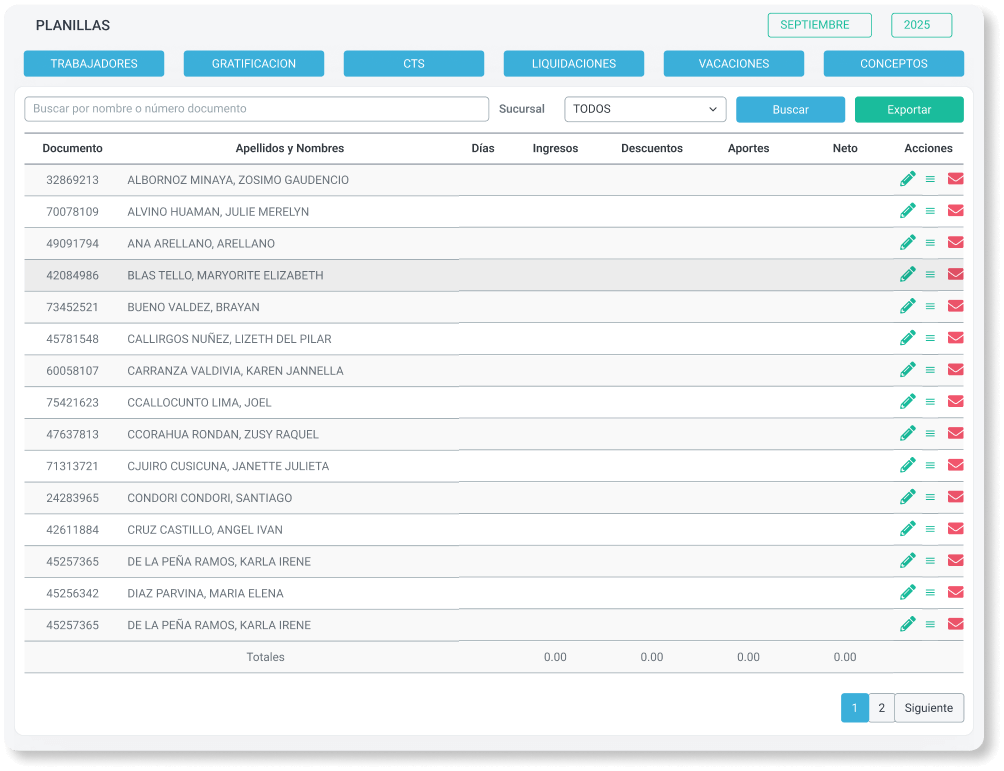 Gestión completa del personal, controla vacaciones, permisos, tardanzas y faltas.